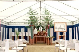 地鎮祭とは、土木工事や建築を行う前に行うものです。その土地に宿る神(氏神)を鎮め土地を利用させてもらうことの許しを得る儀式です